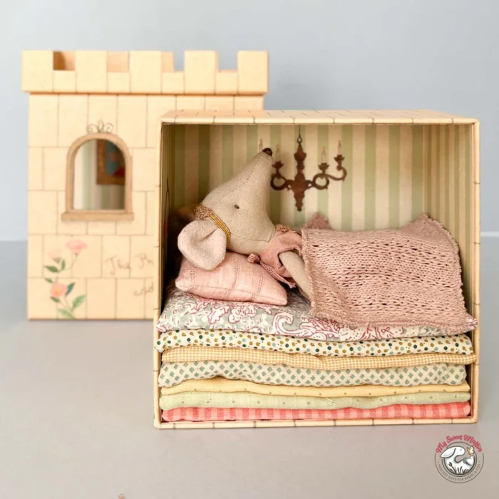 The famous tale of the princess & the pea has been brought to life by Maileg. This set includes a paper castle with mattresses, a pea, and a beautifully dressed princess mouse.